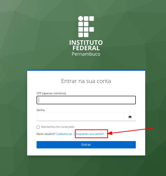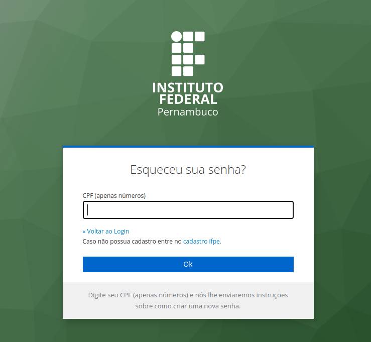 Pré-requisito: O estudante devidamente matriculado, primeiramente deverá solicitar seu E-mail institucional do IFPE através do endereço https://meuemail.ifpe.edu.br. No referido endereço encontram-se as instruções de como solicitar o e-mail. Após ter acesso ao E-mail Estudantil do IFPE, ele poderá recuperar seu cadastro do IFPE.