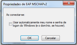 8. Na tela Propriedades EAP MSCHAPv2 que se abre, desmarque a opção Usar automaticamente meu nome e senha de logon do Windows (e o domínio, se houver), em seguida, clique no botão OK.
