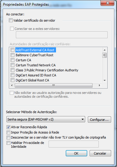 7. Na tela Propriedades EAP Protegidas que se abre, desmarque a opção Validar certificado do servidor. Feito isso, clique em Configurar.