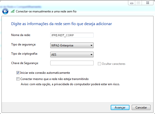 4. Ainda na tela Conectar-se manualmente a uma rede sem fio, em Nome da rede:, preencha com o nome da rede adequada (no caso IFPE/REIT_CORP). Em tipo de segurança: Selecione a opção WPA2-Enterprise, em seguida clique em avançar.