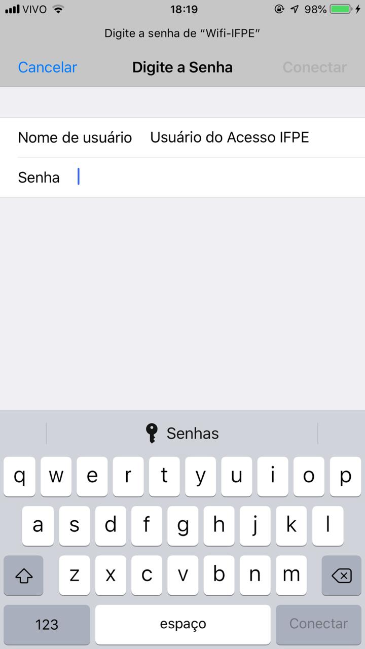 1. Acesse o menu de Conexões sem fio em Ajustes > Wi-fi e escolha a rede desejada, no caso a rede “IFPE/REIT_CORP”